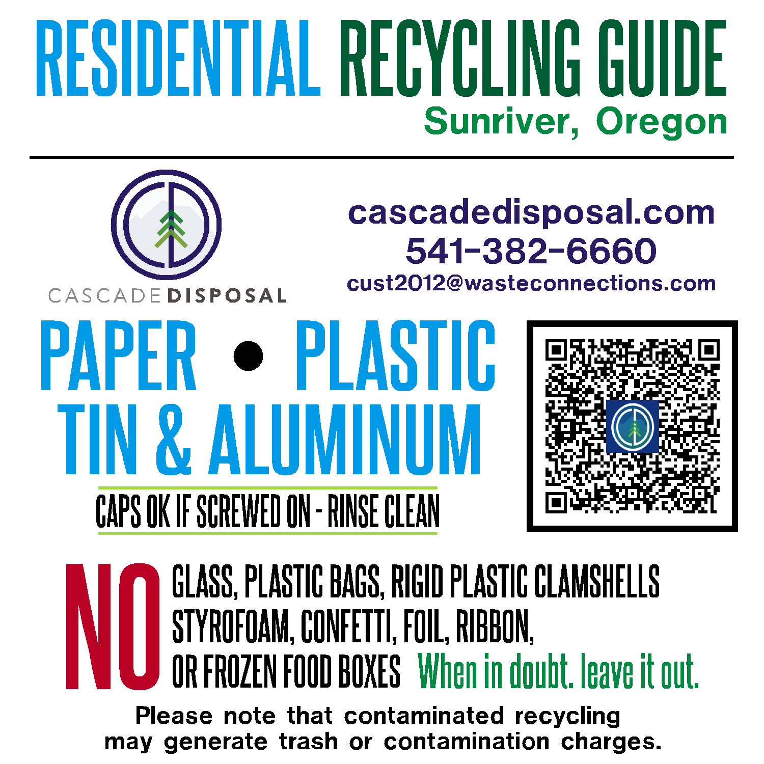 Trash, recycling and glass are picked up 1x per week on your specific scheduled day. Trash collection is also available 2x week upon request for an additional fee. Please download the Cascade Disposal App and input your short address in Sunriver to view your collection schedule.
